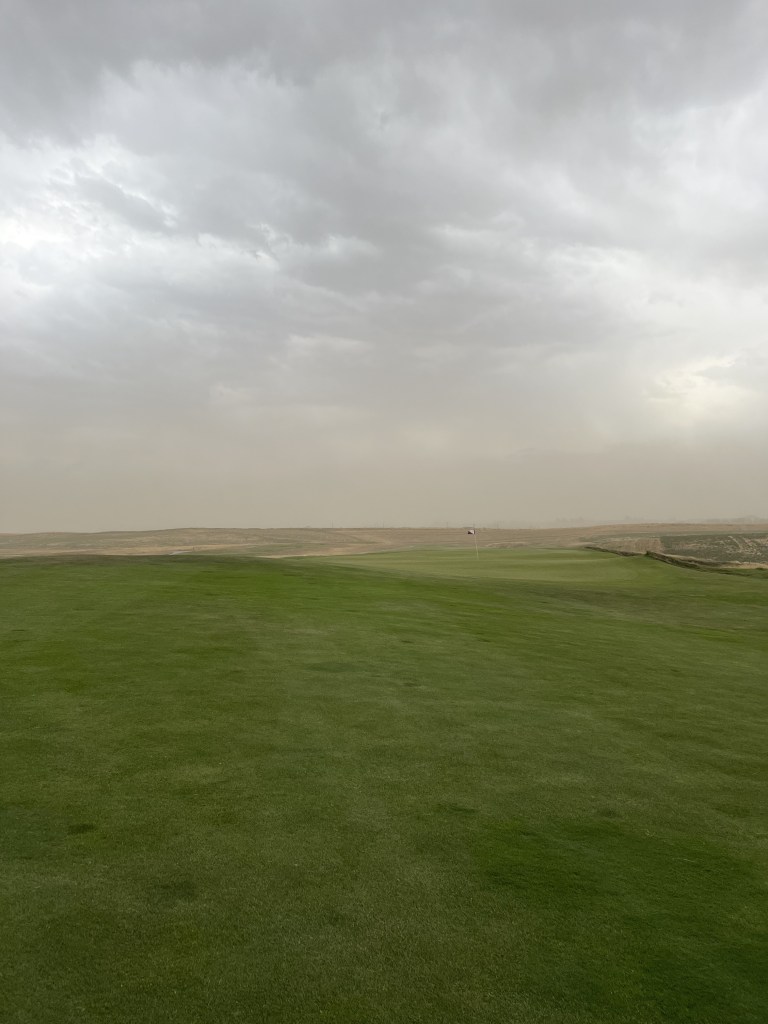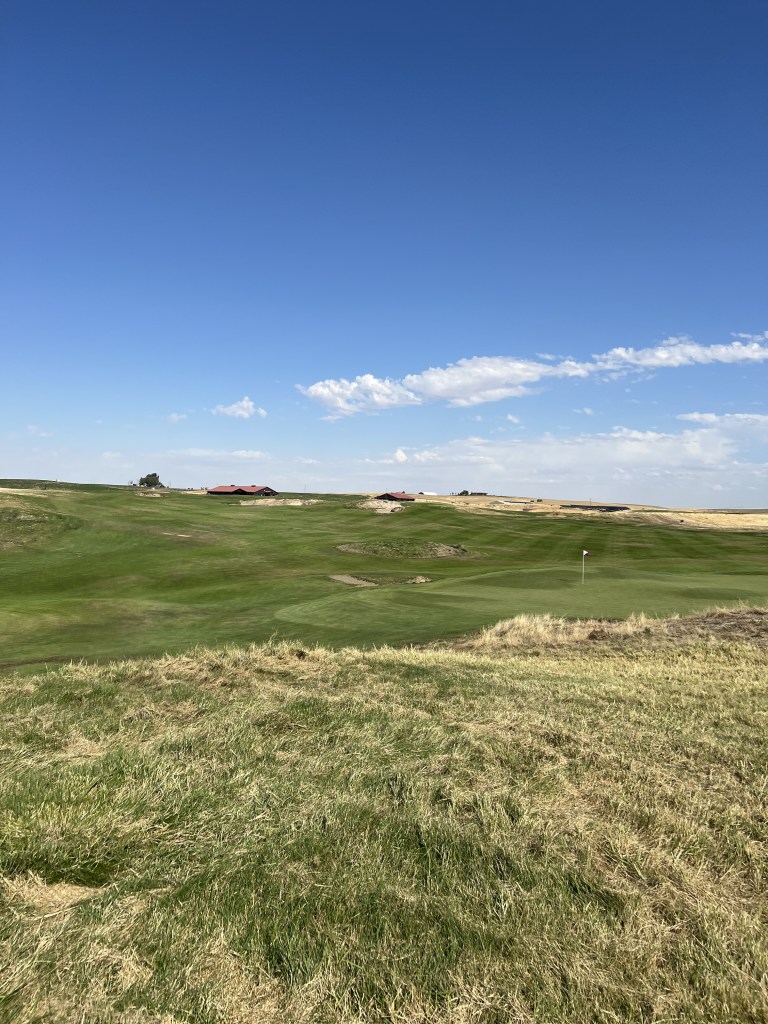 The final two holes at Wine Valley were among my favorite on the golf course. When arriving on the seventeenth, the weather felt like in had improved. The wind was still blowing briskly, but the tumbleweeds were no longer crossing the fairways and the sand remained inside the bunkers. The golf course felt deserted, playing the uphill par-4 seventeenth. One of most visually interesting holes of the day. It was followed by another interesting looking hole, in the eighteenth. A gently sloping downhill par-5, taking us back to the clubhouse and out of the weather. Arriving back in the parking lot, other than the two cars left for the individuals working inside, ours were the only ones left. The weather had driven everyone back into the city. Even with the weather moving in, I enjoyed Wine Valley. I believe the golf course was built by area farmers, who wanted somewhere to play golf, and the experience seemed to encompass that concept. From the feel and energy of the clubhouse, to the view from playing the holes. Most every time I raised my field of view and looked around, I could see fields of farmland. The pictures of a big sky and open spaces, even if they lasted only hours, felt inspiring, and worthy of a return trip. There was a uniqueness about the golf course that has stuck in my memory. A bit like Bandon Dunes in Oregon, or Chambers Bay in Western Washington. But carved out amongst more open spaces. I would like to experience Wine Valley again, hopefully under less threatening skies.